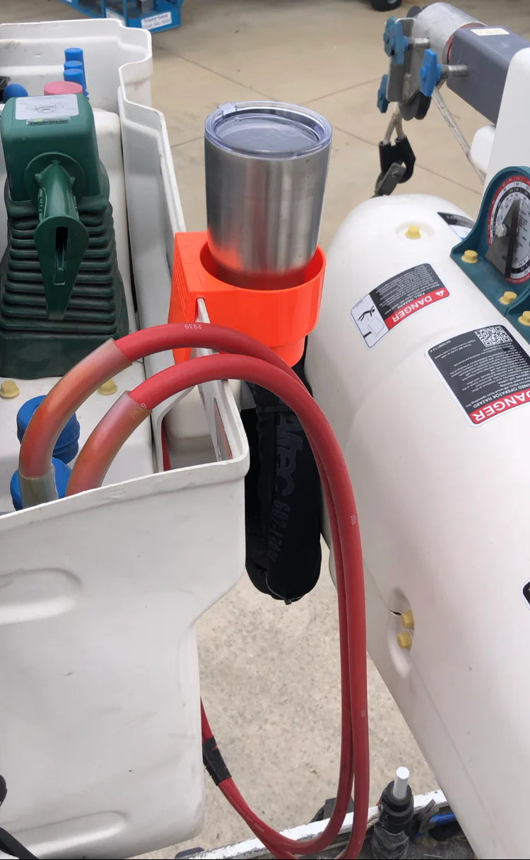 The Line Work Bucket Clip Cup Holder is used by linemen to keep drinks secure and accessible while working from aerial buckets. Designed for overhead distribution work, it clips directly onto the bucket edge to keep hydration within reach without interfering with controls.